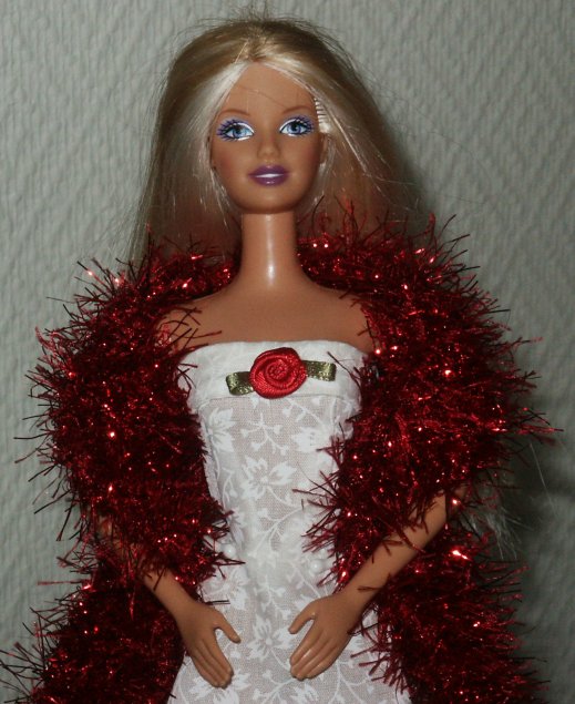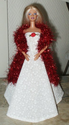 Jättefin barbieklänning i vitt med vita blommor. På bröstet en röd ros och en glittrig röd boa hör till. På lager: 5st