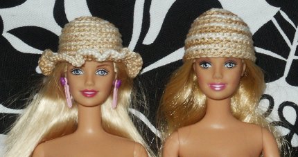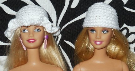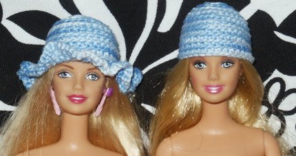 Virkade barbiehattar. Säljs i 2-pack. En med brätte och en utan brätte. Barbiehattar 2st beigemelerade Barbiehattar 2st vita Barbiehattar 2st blåmelerade