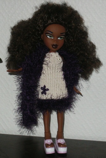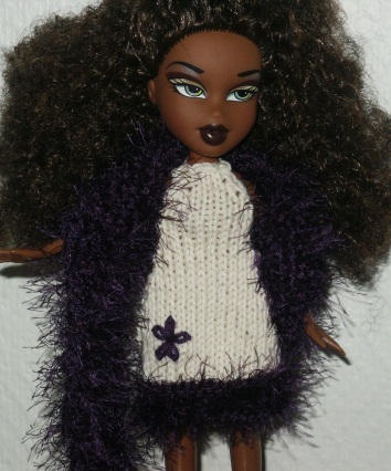 Klänningen är i ett akryl/bomullsgarn med pälskant. Samt boa i lila hör till. Klänningen knyts i nacken.