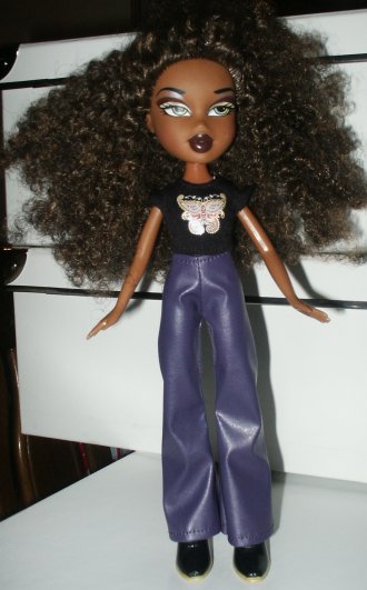 Lila skinnbyxa till bratz. Fästes med kardborrband bak.